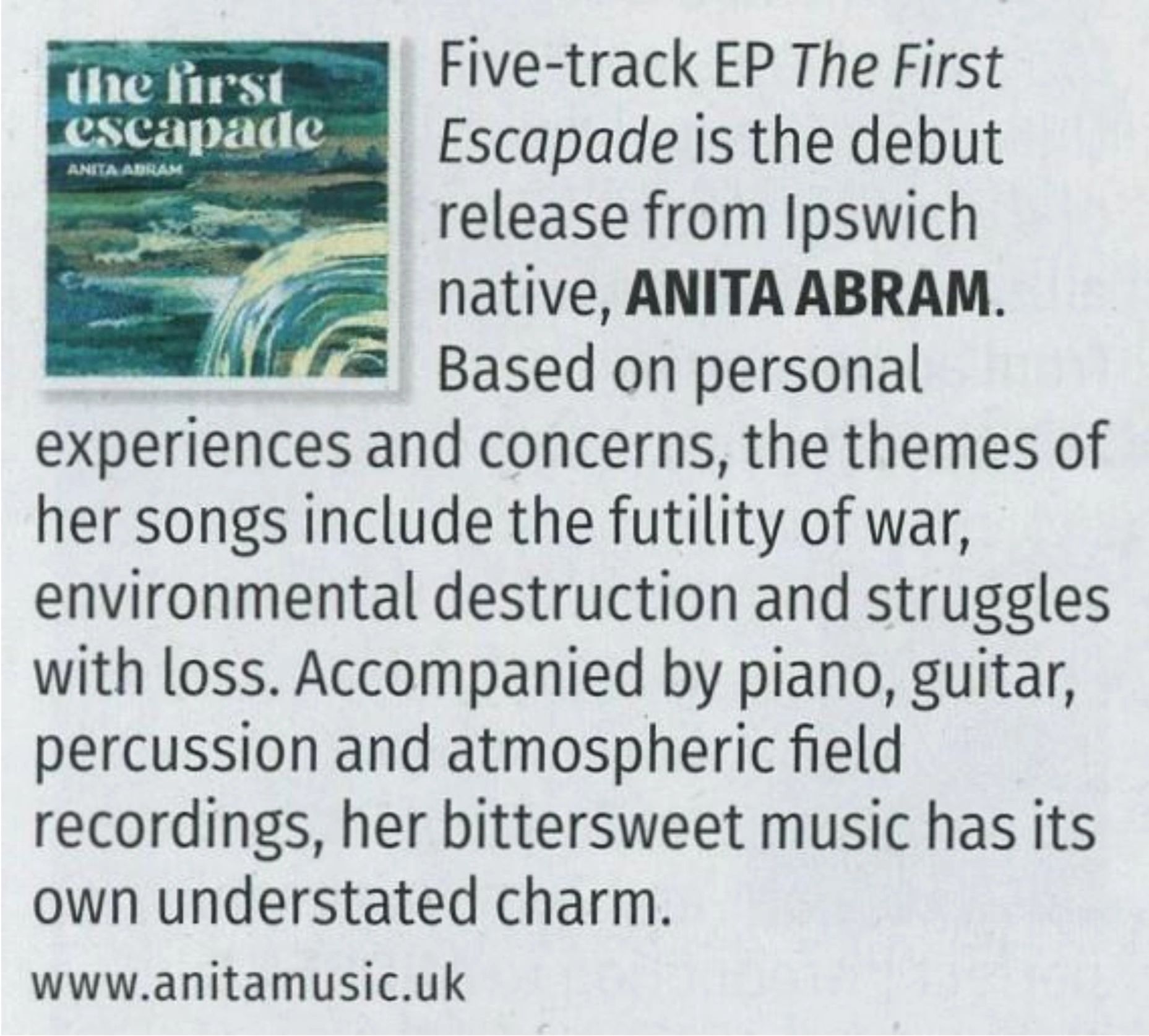 Luke Concannon, best known from the folk duo Nizlopi while influencing a young Ed Sheeran, said “There is something classic in Anita’s song writing. Simple, mythic, deep...”